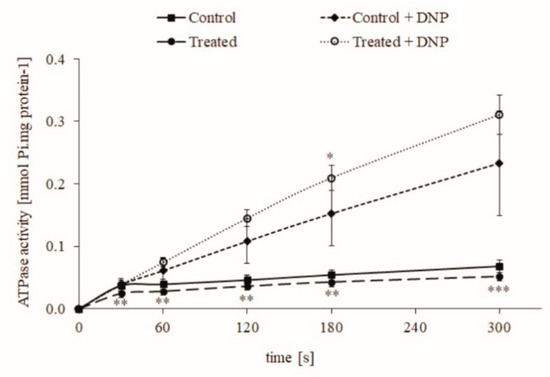 ATP synthase (ATPase) activity of intact rat liver mitochondria from untreated animals (Control) and animals with chronic intake of water from Lake Vaya (Treated). 2.4-dinitrophenol (DNP). Data are presented as mean ± standard error (SEM) of six treated animals. * < 0.05, ** < 0.01, and *** < 0.001—significant differences from the controls.
