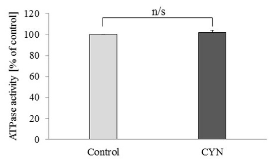 In a second group of in vitro experiments, the direct effect of the toxin CYN on the ATPase activity of freeze-thawed mitochondria from control animals was investigated. Freezing and subsequent thawing leads to disruption of the inner mitochondrial membrane. ATPase activity was recorded in medium with the same composition. The toxin was administered at a final concentration of 1 μM, and after preincubation with the mitochondrial suspension for 10 min, the reaction was started by adding ATP at a final concentration of 1 mM. ATPase activity was calculated as a percentage of the activity (expressed in μM Pi/mg protein min) measured under control conditions (without added CYN).