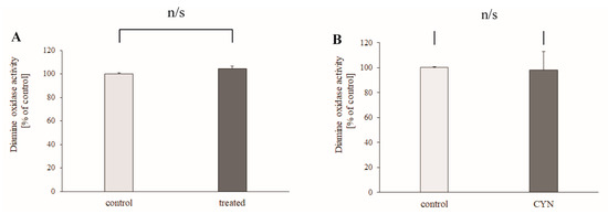 The experiment on the effect of chronic intake of contaminated water on rat liver DAO activity demonstrated that drinking of contaminated water from Lake Vaya did not change significantly the activity of DAO (4.9% ± 2.53%, p = 0.236, n = 6) (Figure 3A). The direct effect of CYN (1 μM) was also studied. In the presence of CYN, the activity of DAO was 101.95 ± 9.87% of the control (p = 0.686, n = 4) (Figure 3B).