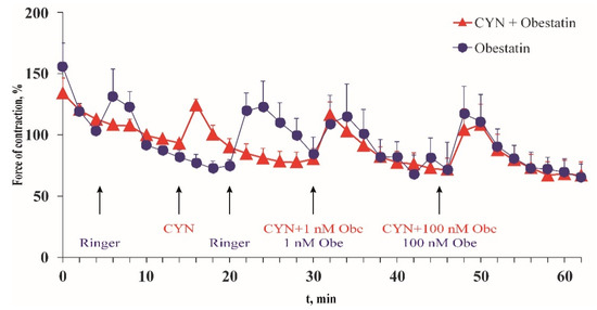 In the presence of 1 μM CYN, the force and frequency of the frog heart contractions were statistically insignificant when compared with the time control (Table 1). In the presence of CYN, the application of obestatin, an activator of epinephrine secretion from the sympathetic nerves in the heart wall, increased the force of the heart contractions (Figure 4). The maximum amplitude of the force of contractions in the presence of CYN was 125% ± 4.74% of the initial value, while in the control experiments it was 134% ± 22.7%.