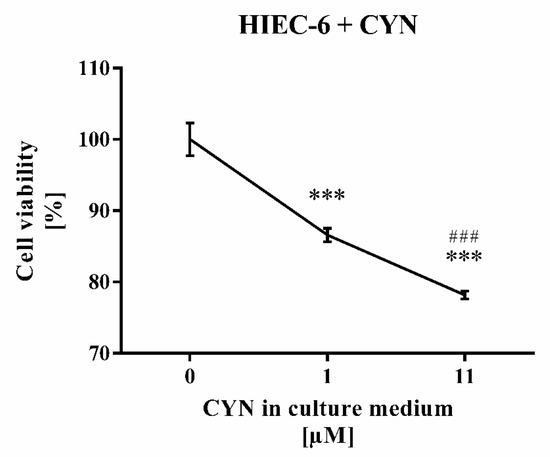 Treatment of human intestinal epithelial cell line (HIEC-6) with higher CYN concentration (11 µM) reduced stronger the cell viability (by 21.8%, p < 0.001) than treatment with its lower (1 µM) concentration (by 13.4%, p < 0.001) (Figure 5).