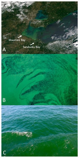 Images of the 2019 WLE CyanoHABs. (A) Satellite imagery from the NASA Terra satellite of the WLE CyanoHAB on 19 August 2019 as provided by NOAA MODIS [37]; (B) Maumee Bay Microcystis-dominated cyanobacterial harmful algal bloom (CyanoHAB) on 4 August 2019 during sampling for the August 2019 bioassays. Photo by H. Plaas; (C) Sandusky Bay Planktothrix-dominated bloom on 4 August 2019 during sampling for the August 2019 bioassays. Photo by H. Plaas.