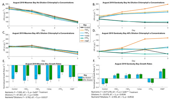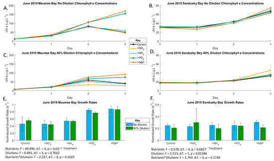 Growth rates of phytoplankton, as determined by chlorophyll a accumulation during the course of incubation in the June 2019 bioassays. (A) Undiluted Maumee Bay water (also see Table S1); (B) undiluted Sandusky Bay water (also see Table S1); (C) 40% dilution Maumee Bay water (also see Table S1); (D) 40% dilution Sandusky Bay water (also see Table S1); (E) Maumee Bay growth rates under the various nutrient addition treatments at the two locations of T3 compared to T0 (also see Table S2). Error bars are standard error; (F) Maumee Bay growth rates under the various nutrient addition treatments at the two locations of T3 compared to T0 (also see Table S2). Error bars are standard error. Significances between treatments for (E,F) are from two-factor ANOVAs.