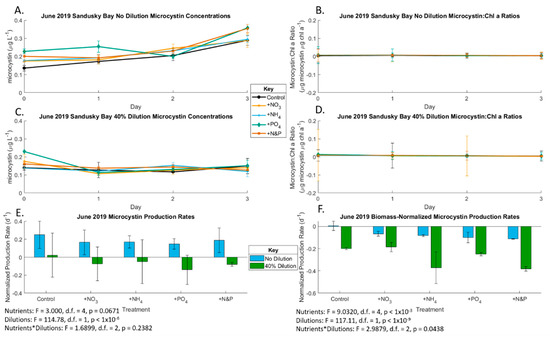 Production rates of microcystin during the June 2019 bioassays. Only Sandusky Bay produced microcystin in June. (A) Undiluted Sandusky Bay microcystin concentrations (also see Table S3); (B) undiluted Sandusky Bay biomass-normalized microcystin concentrations (also see Table S4); (C) 40% dilution Sandusky Bay microcystin concentrations (also see Table S3); (D) 40% dilution Sandusky Bay biomass-normalized microcystin concentrations (also see Table S4); (E) Maumee Bay microcystin production rates under the various nutrient addition treatments at the two locations of T3 compared to T0 (also see Table S5); (F) Maumee Bay biomass-normalized microcystin production rates under the various nutrient addition treatments at the two locations of T3 compared to T0 (also see Table S6). Error bars are standard error. Significance for (E,F) is from n-factor ANOVA analysis due to unbalanced data sets.