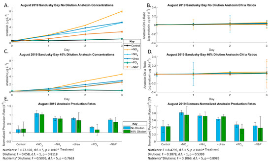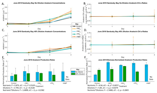 Chlorophyll a-based production rates of anatoxin during the June 2019 bioassays. Only Sandusky Bay produced anatoxin in June. (A) Undiluted Sandusky Bay anatoxin concentrations (also see Table S7); (B) undiluted Sandusky Bay biomass-normalized anatoxin concentrations (also see Table S8); (C) 40% dilution Sandusky Bay anatoxin concentrations (also see Table S7); (D) 40% dilution Sandusky Bay biomass-normalized anatoxin concentrations (also see Table S8); (E) Maumee Bay anatoxin production rates under the various nutrient addition treatments at the two locations of T3 compared to T0 (also see Table S9); (F) Maumee Bay biomass-normalized anatoxin production rates under the various nutrient addition treatments at the two locations of T3 compared to T0 (also see Table S10). Error bars are standard error. Significance for (E,F) is from n-factor ANOVA analysis due to unbalanced data sets.
