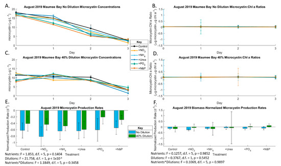 Production rates of microcystin during the August 2019 bioassays. Only Maumee Bay produced microcystin in all samples. (A) Undiluted Maumee Bay microcystin concentrations (also see Table S3); (B) undiluted Maumee Bay biomass-normalized microcystin concentrations (also see Table S4); (C) 40% dilution Maumee Bay microcystin concentrations (also see Table S3); (D) 40% dilution Maumee Bay biomass-normalized microcystin concentrations (also see Table S4); (E) Maumee Bay microcystin production rates under the various nutrient addition treatments at the two locations of T3 compared to T0 (also see Table S5); (F) Maumee Bay biomass-normalized microcystin production rates under the various nutrient addition treatments at the two locations of T3 compared to T0 (also see Table S6). Error bars are standard error. Significance for (E,F) is from 2-factor ANOVA analysis.