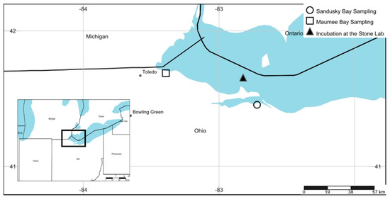 Map of the sampling sites and the location of the incubation. Maumee Bay water was collected off a bulkhead dock near the University of Toledo Lake Erie Center in Oregon, OH, USA. Sandusky Bay sampling took place at a dock outside the Paper District Marina in Sandusky, OH, USA. Incubation took place at The Ohio State Stone Laboratory on South Bass Island (Put-In-Bay, OH, USA). GPS coordinates for the sampling and incubation sites can be found in Table S11. This figure was created with www.simplemappr.net [106].
