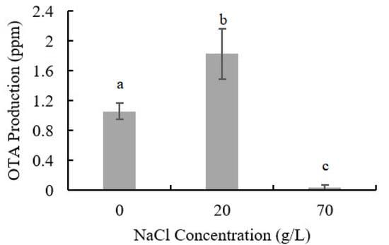 OTA production in seven days of culture in PDA medium with NaCl addition. Results are presented as the mean of three repetitions. Different letters indicate a significant difference between the corresponding values (p < 0.05).