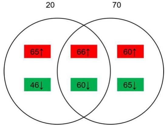 The comparison between the samples with 20 g/L NaCl added or without was named group A, while that with 70 g/L NaCl added or without was named group B. A total of 2646 proteins were identified. There were 237 differentially expressed proteins (DEPs) identified (|Log2 ratio | > 1.5, p < 0.05), of which 131 were upregulated and 106 were downregulated in group A; 251 DEPs were identified (|Log2 ratio| > 1.5, p < 0.05), of which 126 were upregulated and 125 were downregulated in group B. As shown in Figure 3, 126 proteins were found both regulated in two groups, of which 66 proteins were upregulated and 60 proteins were downregulated. The alternation number of proteins in group B was larger than group A, indicating that 70 g/L NaCl addition may cause more influence on the growth and development of A. ochraceus than does 20 g/L NaCl addition.