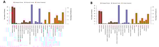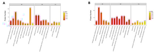 GO functional classification of DEPs. (A) Group A, 20 g/L NaCl addition vs. control; (B) Group B, 70 g/L NaCl addition vs. control.