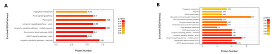 KEGG pathway enrichment results are shown in Figure 6. KEGG pathway enrichment analysis indicated that proteins involved in MAPK (mitogen activated protein kinase) signaling pathway, peroxisome, longevity regulating pathway, FoxO signaling pathway, and tryptophan metabolism were significantly regulated in two groups. However, proteins related to estrogen signaling pathway, NOD (nucleotide-binding and oligomerisation domain-containing protein)-like receptor signaling pathway, glyoxylate and dicarboxylate metabolism, and steroid biosynthesis were significantly regulated in group B.