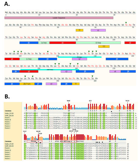 Scabin sequence profile. (A) Full-length Scabin sequence showing the leader sequence (salmon), TT/TTT (turns, yellow), n1 (310 helix, mauve), βi (beta strands, blue), αi (helices, red), and Lx (loops, olive green). (B) Multiple sequence alignment of Scabin with the Pierisin-family toxins was produced using Muscle [38] and generated using SnapGene ver 5.2 (San Diego, CA). Identical residues shared among the Pierisin family members are highlighted in green and a conservation histogram is shown above the sequence according to color and bar height. The important residues for DNA binding in Scabin are shown with a filled black circle. The PN- and ARTT-loop sequences are shown for the Scabin sequence and the important catalytic sites are indicated (except for W68, which is a structural residue). The Uniprot (https://www.uniprot.org/) identifiers for the sequences are as follows: Scabin (C9Z6T8), ScARP (Q9L1E4), Pierisin-1 (H3JU00), Pierisin-1b (E7EKM3), Pierisin-2 (Q9GV36), Pierisin-3 (C6L2F5), Pierisin-4 (C6L2F6), and Pierisin-5 (A0A0H3V1I0).