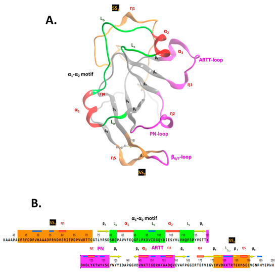 Scabin 3D-topology and sequence. (A) Ribbon drawing of Scabin X-ray structure (PDB: 5DAZ) with the following nomenclature: αi for alpha-helix, ηi for 310-helix, and βi for β-strand secondary-structure elements. The PN-loop (Y120-G132), ARTT-loop (V145-E160), and β6/7-turn (K180-R184) are shown in fuchsia; the SS1-loop (C42-C72) and SS2-loop (C176-C190) in amber; and the α1-α2 motif (S80-P114) is rendered with the α-helices in red and coiled segments in green. (B) The Scabin catalytic core sequence is shown with corresponding color matches to the X-ray ribbon representation shown in (A).