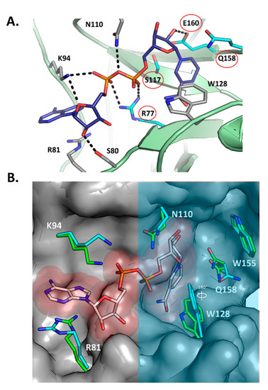 Figure 3A shows the structure of Scabin with NADH (PDB: 5TLB) bound in the active site along with the key primary catalytic residues (Arg77, Ser117, Gln158, and Glu160—red circles). Upon NADH binding, the overall substrate pocket architecture of the enzyme is preserved with respect to the apo form (PDB: 5DAZ), according to the small Cα-RMSD of 0.27 Å (for 24 residues). This fluctuation in the pocket backbone atoms might have its origin in the intrinsic dynamics of the protein since it has the same magnitude as in the entire protein (Cα-RMSD = 0.27 Å for 165 residues). Notably, upon binding the NAD(H) substrate/inhibitor, the side-chains of the pocket residues are conformationally shifted (RMSD = 0.94 Å, 24 residues), as observed mainly for Arg81, Lys94, Asn110, Trp128, and the catalytic Gln158 (RMSD = 1.76 Å for all-atoms of 5 residues) (Figure 3B). For the catalytic Gln158, two alternate conformations of this side-chain were observed, one that is identical to the apo form and one that is distinct.