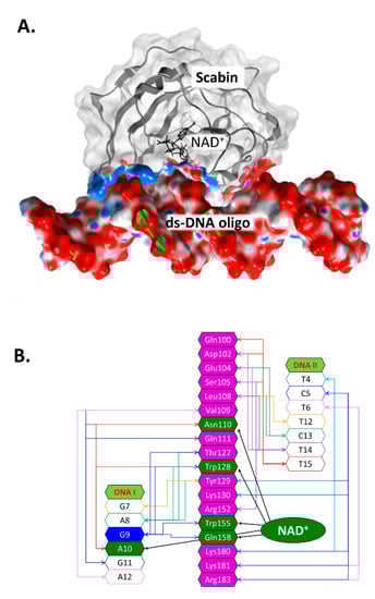 Previously, an in silico Scabin model complexed with NAD+ and with a ds-DNA oligomer (21-bp) was prepared by a docking protocol [29]. In the Scabin-NAD+-DNA ternary complex (Figure 4A), the solution conformation of Scabin unveils a smaller difference (structural) between the apo-Scabin (PDB: 5DAZ) structure and the enzyme-NADH complex (PDB: 5TLB), with RMSD Cα values of 0.88 Å and 0.95 Å, respectively. The NAD+ substrate conformation is very similar to NADH in the Scabin-NADH complex (PDB: 5TLB) and to NAD+ in the Pierisin-1-NAD+ complex (PDB: 5H6J).