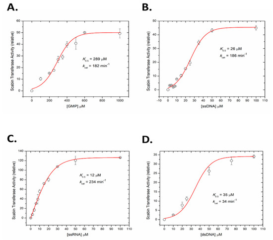 A fluorescence-based assay was developed to measure the kinetics of Scabin ADP-ribosyltransferase activity to guanine nucleotides, including RNA and DNA oligonucleotides. GMP was used as a model nucleotide substrate for Scabin transferase activity and the rate curve against GMP concentration is shown in Figure 5A. The kinetic curve was sigmoidal in nature and the calculated K0.5 was 289 ± 18 μM with a kcat over 180 min−1. The kinetic curve for ss-DNA (21-mer with multiple guanine bases, see Materials and Methods for details) is also sigmoidal and is shown in Figure 5B; it reveals that Scabin has a much higher affinity for DNA compared with a single nucleotide substrate such as GMP (K0.5 = 26 ± 1 μM; kcat = 186 min−1). The identical nucleotide sequence and length of the ss-RNA was also tested as a Scabin substrate, which showed that Scabin slightly prefers ss-RNA over ss-DNA (K0.5 = 12 ± 0.5 μM; kcat = 234 min−1), as shown in Figure 5C. Interestingly, the curve for the ss-RNA substrate was less sigmoidal and nearly hyperbolic in shape (Figure 5C). Further tests showed that Scabin also gave strong kinetic activity with ds-DNA (K0.5 = 34 ± 2 μM, kcat = 34 min−1) but the substrate turnover rate was considerably slower than the ss-DNA substrate (Figure 5D). The slower kcat for the ds-DNA substrate likely indicates the requirement for separation of the base pairs by the Scabin enzyme and base flipping in ds-DNA for the transfer reaction to the guanine base to occur [39].