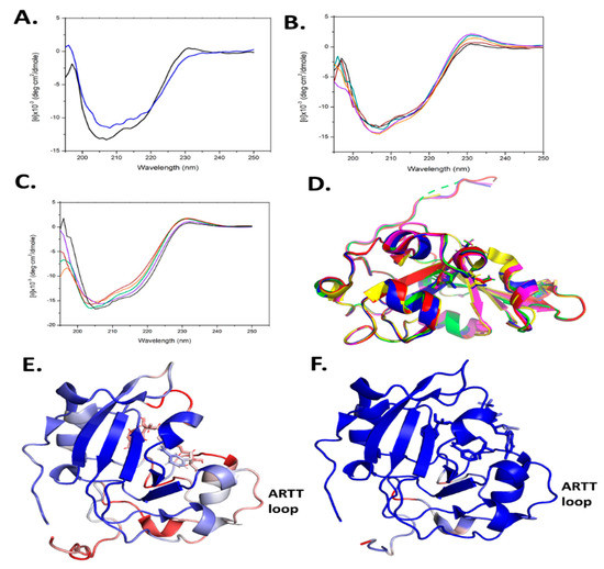 Site-directed mutagenesis was used to prepare several Scabin variants, as mentioned above. However, this approach may often lead to misfolded or partially folded proteins upon recombinant expression and purification. To assess the folded integrity of the Scabin variants, two approaches were taken: (i) determination of the X-ray crystal structure where possible (apo-WT, PDB: 5DAZ; V109G, PDB: 6VV4; N110A, PDB: 6VPA; S117A, PDB: 6VUV; W128Y, PDB: 6APY; Y129H, PDB: 6UVF; and W155A, PDB: 5UVQ); and (ii) circular dichroism (CD) spectroscopy was conducted to assess the solution’s secondary structure. The CD results for some of the variants were previously reported [20,29] and the CD spectra for the remaining variants are shown in Figure 6A–C. It is noteworthy that the R77A and W69A variants could not be studied for catalytic activity since they were not properly folded (data not shown). In addition, the Y129T variant showed some perturbation in its CD spectrum (Figure 6A). The rest of the Scabin variants showed either a WT-like crystal structure (Figure 6D) [20,29] or similar CD spectra to the WT in solution (Figure 6B,C) [20,29].
