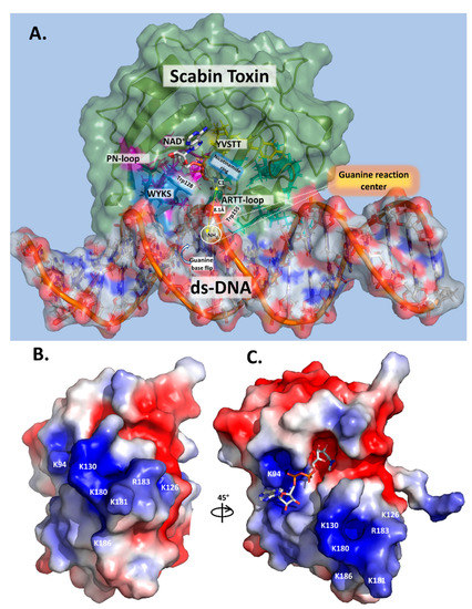 In the Pierisin-like mART toxin group, the sequence motif Rβ1-RLa-NLc-STTβ2-WPN-WARTT-(QxE)ARTT appears as a signature motif involved in the mART catalytic function of these proteins/toxins. Importantly, (i) the reported DNA-contacting residues/motifs in Pierisin-1 are not present in Scabin; and (ii) many of the proposed DNA-contacting residues/motifs in Scabin are not present in other members of the Pierisin-like group. Thus, it may be concluded that Scabin possesses a unique DNA-binding motif within the Pierisin family. Scabin has a positively charged surface that serves as a DNA/RNA binding surface, which can be seen in Figure 7B,C, and it is largely shared with ScARP but no other Pierisins (Figure 1B). The Scabin central core structure is like that of ScARP, Pierisin-1, and other ADP-ribosyltransferases [32]. However, Scabin and ScARP do not possess either a ricin B-like domain or an autoinhibitory linker as found in Pierisin-1, implying that enzyme regulation is different between Scabin/ScARP and Pierisin-1. The arrangement of the α-helices and loop regions around the core scaffold is also different in Scabin/ScARP and their PN-loops are much smaller than in Pierisin-1 (Figure 1B) [28,32]. The key positively charged residues for DNA binding are also not conserved between Pierisin-1 and Scabin/ScARP (Figure 1B, filled black circles; Figure 7B,C) [32]. These observations indicate that the binding mode and preference for various guanine-containing substrates differ between Scabin/ScARP and Pierisin-1. Clearly, the DNA-binding and targeting mechanisms, including biological roles, are not universal among the Pierisin family members. Structural elucidation of the full Michaelis complex of various Pierisin family members with both NAD+ and ds- and ss-DNA substrates is the next step towards a better understanding of the reaction mechanism of the DNA-targeting ADP-ribosyltransferases.