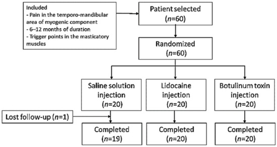 - Sidebottom, A.J.; Patel, A.A.; Amin, J. Botulinum injection for the management of myofascial pain in the masticatory muscles. A prospective outcome study. Br. J. Oral Maxillofacial Surg. 2013, 51, 199–205. [Google Scholar] [CrossRef]