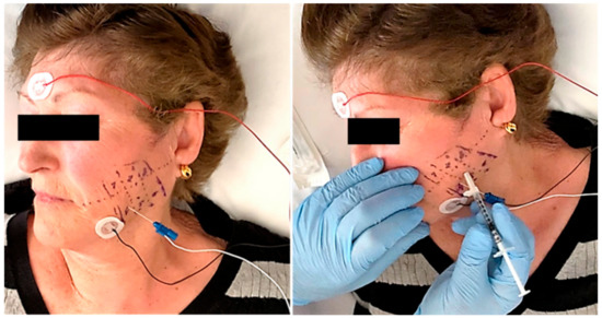 - Awan, K.H.; Patil, S.; Alamir, A.W.H.; Maddur, N.; Arakeri, G.; Carrozzo, M.; Brennan, P.A. Botulinum toxin in the management of myofascial pain associated with temporomandibular dysfunction. J. Oral Pathol. Med. 2019, 48, 192–200. [Google Scholar] [CrossRef] [PubMed]