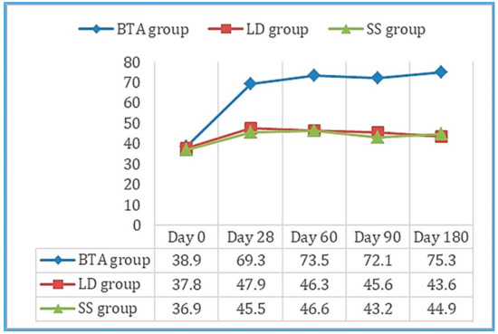 Mean scores obtained on the 100-point questionnaire throughout the follow-up period in the three study groups. Results improved significantly between day 0 and 180 in the BTA group.