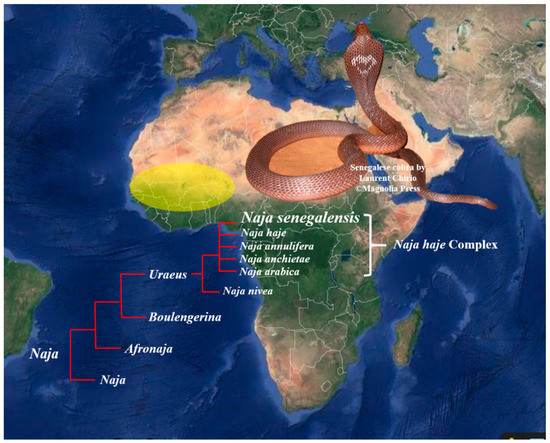 12. Trape, J.-F.; Chirio, L.; Broadley, N.G.; Wüster, W. Phylogeography and systematic revision of the Egyptian cobra (Serpentes: Elapidae: Naja haje) species complex, with a description of a new species from West Africa. Zootaxa 2009, 2236, 1–25. [Google Scholar] [CrossRef]