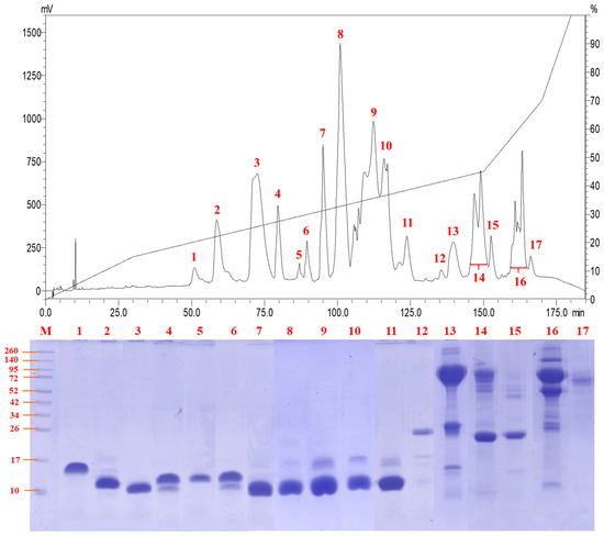 The fractions collected from RP-HPLC was reconstituted in ultrapure water and separated by 15% sodium dodecyl sulfate-polyacrylamide gel electrophoresis (SDS-PAGE) under reducing condition at 100 V for 2 h. Thermo Scientific Spectra™ Multicolor Broad Range Protein Ladder (Thermo Scientific™ Pierce™, Rockford, IL, USA) containing 10 prestained proteins ranging from 10 kDa to 260 kDa was used for molecular mass calibration. Gel was stained with Coomassie Brilliant Blue R-250 and the bands were scanned using ImageScanner III (GE Healthcare, Uppsala, Sweden).