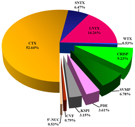 Figure 3. Snake venom proteome of Naja senegalensis. Proteomic profiling was accomplished with QTOF nano-ESI-LCMS/MS of reverse-phase HPLC-fractionated venom proteins. All protein samples were subjected to in-solution tryptic digestion. Abbreviations: CTX, cytotoxin/cardiotoxin; SNTX, short neurotoxin; LNTX, long neurotoxin; WTX, weak neurotoxin; CRISP, cysteine-rich secretory protein; CVF, cobra venom factor; KSPI, Kunitz-type serine protease inhibitor; PDE, phosphodiesterase; SVMP, snake venom metalloproteinase; 5′-NUC, 5′-nucleotidase. CTX, SNTX, LNTX, and WTX constituted three-finger toxins (3FTX) superfamily.