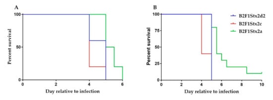 Survival curves in Str-treated BALB/c mice for B2F1Stx2d2, B2F1Stx2a, and B2F1Stx2c. (A) Survival after an inoculum of 109 CFU/mouse. (B) Survival after an inoculum of 103 CFU/mouse. The survival curves were not statistically different at the 109 dose. At the 103 dose, the B2F1Stx2a survival curve was different than both the B2F1Stx2d2 and B2F1Stx2c survival curves, p = 0.005 or p = 0.0008, respectively. n = 5 (B2F1Stx2d2 and B2F1Stx2c) or 10 (B2F1Stx2a) mice.