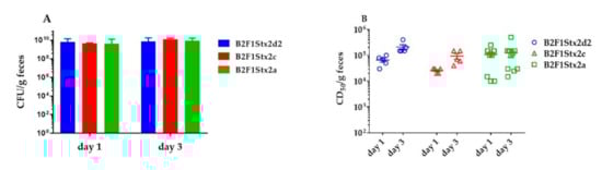 The CFU (A) and CD50/g feces (B) from mice inoculated with 103 CFU of the indicated strains as measured on days 1 and 3 post-infection. The CD50/g feces were higher on day 3 as compared to day 1 for both B2F1Stx2d2 and B2F1Stx2c (p = 0.001), though the CFU/g feces did not change. Each symbol represents an individual mouse. n = 5 (B2F1Stx2d2 and B2F1Stx2c) or 10 (B2F1Stx2a) mice. Data were compared by two-way ANOVA on the log-transformed values.