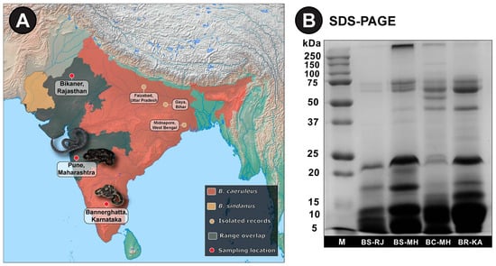 The range distribution of Bungarus spp. in Southern and Western India and SDS-PAGE profiles of their venoms. (A). Panel A of this figure shows the range distribution of B. sindanus (light brown) and B. caeruleus (red), and their range overlaps (grey) in the Indian subcontinent. Isolated records of B. sindanus (light brown circles), along with sampling locations (red circles) of venoms and venom glands have also been shown. (B). SDS-PAGE profiles of venom samples [B. sindanus (Rajasthan and Maharashtra), B. caeruleus (Maharashtra) and B. romulusi (Karnataka)], along with the marker (M), are shown in panel B.