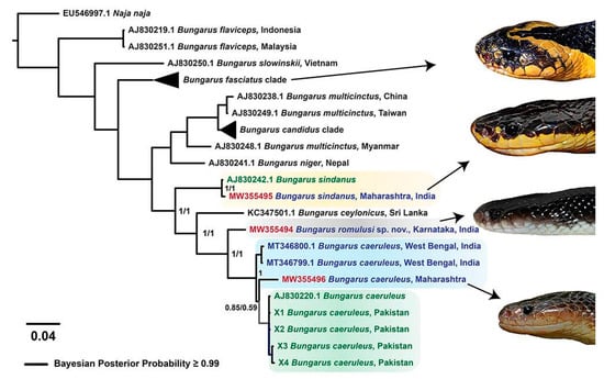 Bayesian phylogeny of Bungarus species. This figure highlights the phylogenetic relationships between Bungarus species in Asia. Distinct lineages of kraits of interest have been shown in uniquely coloured boxes. Branches with superior node support (BPP ≥ 0.95) are shown in thick black lines, and the BPP values for ND4 and cyt b markers are indicated for the clades of interest. Branch lengths in the tree are scaled by the number of nucleotide substitutions per site. Photographs depicting the lateral view of B. fasciatus, B. sindanus, B. romulusi and B. caeruleus have also been shown.