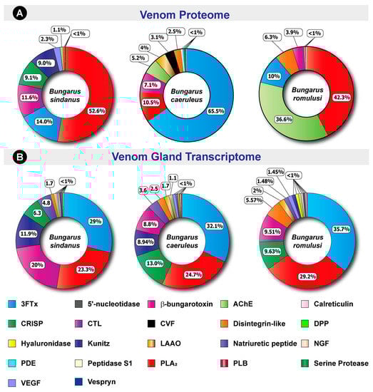The comparative venom proteomic and venom gland transcriptomic profiles of B. sindanus, B. caeruleus and B. romulusi. Here, doughnut charts depict the relative abundance of various toxins in (A) the venom proteome and (B) the venom gland transcriptomes of the three cryptic kraits. Individual toxins are uniquely colour coded, and their relative abundances are indicated in percentages.