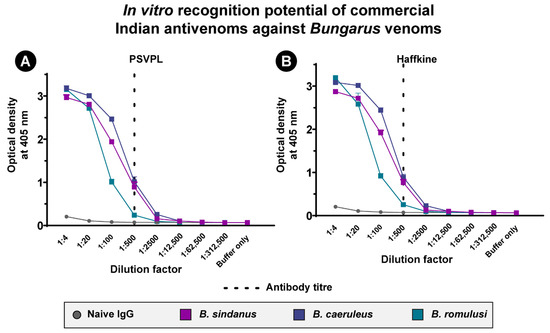 The in vitro binding abilities of commercial Indian antivenoms against the Bungarus venoms were determined using indirect ELISA as described before [15,74]. We coated 96-well immunoplates with crude venoms (100 ng) diluted in the carbonate buffer (pH 9.6), followed by overnight incubation at 4 °C. The plates were washed six times with Tris-buffered saline (0.01 M Tris pH 8.5, 0.15 M NaCl) and 1% Tween 20 (TBST), followed by the addition of blocking buffer (5% skimmed milk in TBST). After the completion of three hours of incubation at room temperature, the plates were again washed with TBST (n = 6), followed by the addition of various dilutions of commercial Indian antivenoms (1:4 to 1:312500). The plates were then incubated overnight at 4 °C. Unbound primary antibodies were washed off with a series of TBST washes (n = 6) the next day, followed by the addition of 100 µL horseradish peroxidase (HRP)-conjugated, rabbit anti-horse secondary antibody (Sigma-Aldrich, St. Louis, MO, USA; 1:1000 dilution in PBS buffer). The plates were incubated for two hours at RT and 2,2′-Azino-bis(3-ethylbenzothiazoline-6-sulfonic acid) substrate solution (Sigma-Aldrich, St. Louis, MO, USA) was added for colour development. The absorbance, which is directly proportional to the venom recognition capability of the antivenom, was measured at 405 nm in an Epoch 2 microplate spectrophotometer (BioTek Instruments, Inc., Winooski, VT, USA). The statistical significance of the result was evaluated by two-way ANOVA with Tukey’s and Dunnett’s multiple comparisons in GraphPad Prism (GraphPad Software 8.0, San Diego, CA, USA, www.graphpad.com). IgG from an unimmunised horse was used to calculate the non-specific binding cut off as described previously [15,74].