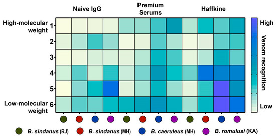Immunoblotting experiments revealed that the commercial antivenoms very poorly recognised the highly abundant low-molecular-weight toxins (<20 KDa) in Bungarus venoms (Figure 5 and Figure S6). While Premium serums antivenom exhibited relatively increased binding towards the B. caeruleus venom in comparison to the venoms of B. romulusi and the two populations of B. sindanus, the Haffkine antivenom failed to recognise several toxins from all Bungarus species tested in the study (Figure 5 and Figure S6). As the Haffkine antivenoms are manufactured by sourcing venoms from the state of Maharashtra in Western India, the poor venom recognition of this antivenom against the source venom immunogen population is surprising. Moreover, non-specific binding of naive horse Immunoglobulins G (IgGs) towards certain toxin bands was also observed.