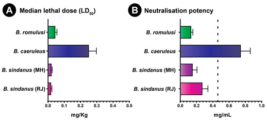Evaluation of toxicity profiles (or the median lethal dose (LD50)) of Bungarus species in the mouse model revealed dramatic differences in venom potencies. While the toxicity of B. caeruleus, the most potent of the ‘big four’ Indian snakes, was in line with previous findings (0.25 mg/kg; [15]), the newly discovered B. romulusi exhibited six times more toxicity (0.045 mg/kg). Moreover, B. sindanus (the 17 DSR krait from Maharashtra) was found to be amongst the most toxic snakes identified in India. Consistent with the toxicity score reported for the Rajasthani population of this species (0.018 mg/kg; [15]), B. sindanus from Maharashtra was characterised with an LD50 of 0.02 mg/kg (Figure 6A, Table S14).