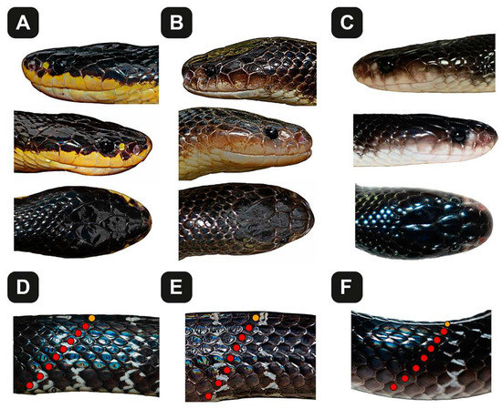 Phenotypic similarities and differences in the cryptic kraits of Southern and Western India. These photographs highlight the morphological differences between (A) B. sindanus, (B) B. caeruleus and (C) B. romulusi. The images in the panels (D–F) show the lateral view of the mid-body, highlighting the edges of the ventral scales, the adjacent dorsal scale rows (7 or 8 red dots) and the uppermost dorsal scale row (yellow dot). The corresponding scale rows on the other side are not visible, and the total mid-body dorsal scale count (i.e., 17 in B. sindanus and 15 in B. caeruleus and B. romulusi) is by inference. Full-body images of B. romulusi have also been deposited in MorphoBank (#3897).