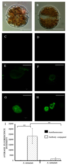 An immunostaining differentiation between A. minutum and A. tamutum using an antibody raised against A. minutum cell lysates was conducted to assess the biochemical difference between these organisms. This monoclonal antibody, developed by Carrera et al. (2010), was raised in BALB/c mice, with the mouse sera extracted at 10–14 days post-immunization [35]. The monoclonal antibody showed significant and selective staining of A. minutum as compared to other Alexandrium species such as A. tamarense and A. andersonii [35].