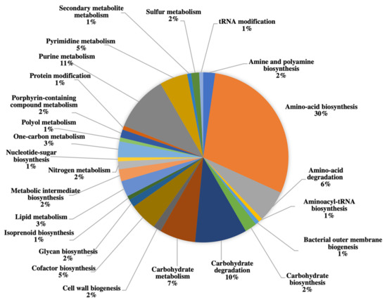 A breakdown of the proteins identified with biological pathways showed distribution as follows: amino-acid biosynthesis (30%), purine metabolism (11%), carbohydrate degradation (10%), carbohydrate metabolism (7%), amino acid degradation (6%), cofactor biosynthesis (5%), pyrimidine metabolism (5%), lipid metabolism (3%), one-carbon metabolism (3%), amine and polyamine biosynthesis (2%), carbohydrate biosynthesis (2%), cell wall biogenesis (2%), glycan biosynthesis (2%), metabolic intermediate biosynthesis (2%), nitrogen metabolism (2%), porphyrin-containing compound metabolism (2%), sulfur metabolism (2%), aminoacyl-tRNA biosynthesis (1%), bacterial outer membrane biogenesis (1%), isoprenoid biosynthesis (1%), nucleotide-sugar biosynthesis (1%), polyol metabolism (1%), protein modification (1%), secondary metabolite metabolism (1%) and tRNA modification (1%) (Figure 2).
