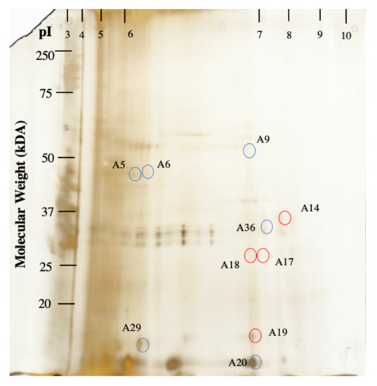 Two-dimensional gel separation of A. tamutum and A. minutum. A. minutum was labeled with Cy3 while A. tamutum was labeled with Cy5 (Supplementary Figure S2). Proteins were separated in the first dimension using an immobilized pH gradient isoelectric focusing pI 3–10. Proteins were further separated in the second dimension based on molecular weight by SDS-PAGE. 2D gels were subjected to silver staining. Ten manually excisable protein spots were identified by tandem mass spectrometry (MS/MS). Protein spots with increased amounts in A. tamutum and A. minutum are labelled with red and blue circles, respectively.
