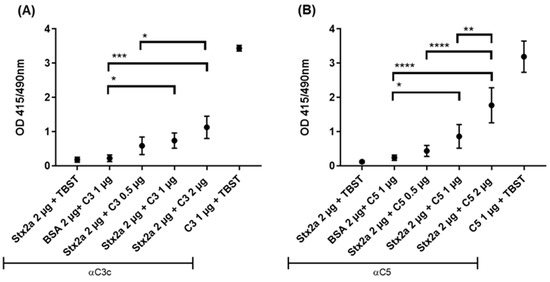 Binding of Stx2a to complement C3b or C5 was assessed by ELISA. Stx2a was coated onto the solid phase of microtiter plates followed by incubation with C3b (as uncleaved C3 is not stable enough) or C5 diluted in tween buffer (TBST). When equal or greater amounts than 1 µg of C3b or C5 were added, both C3b (Figure 1A) and C5 (Figure 1B) showed a significant, specific binding to Stx2a upon detection with anti-human C3c and anti-human C5 antibodies, respectively, when compared to the negative control—bovine serum albumin (BSA) coated wells, incubated with C3b/C5 and detected with anti-C3c/C5 antibodies.