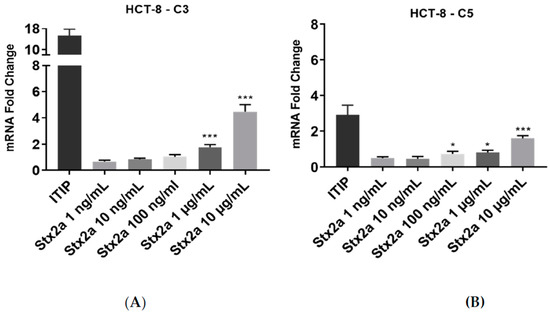 Increasing Stx2a concentrations were also applied to human colon epithelial HCT-8 cells for 6 h. There was no significant change in expression of C3 mRNA at Stx2a concentrations ranging from 1 to 100 ng/mL. The same was true for the expression of C5 transcript at Stx2a concentrations ranging from 1 to 10 ng/mL. HCT-8 cells showed a slight upregulation in C5 mRNA expression upon stimulation with 100 ng/mL of Stx2a. To observe whether HCT-8 cells require stimulation with higher Stx2a concentrations to upregulate complement transcripts, the cells were treated with 1 and 10 µg/mL Stx2a for 6 h. This led to a significantly higher mRNA expression of C3 and C5, where stimulation with 10 µg/mL yielded the greatest increases in mRNA expression (Figure 3). Cells were treated with a standardized cocktail of pro-inflammatory cytokines used for monocytes maturation—ITIP (103 U/mL IL-1β, 10 ng/mL TNF-α, 103 U/mL IL-6 and 1 µg/mL PGE-2) [22,30]—which contained three cytokines previously described as inducers of complement components expression in human intestinal epithelial cells [31]. The treatment with ITIP resulted in an upregulation of complement C3 and C5 mRNA, being stronger for C3.