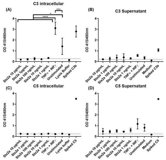 C3 and C5 protein synthesis in HK-2 cell line. OD values of sandwich ELISA assessing intracellular (A,C) and extracellular (B,D) protein expression of C3 (A,B) and C5 (C,D) in HK-2 cells after 9 h stimulation with increasing concentrations of Stx2a (0.001–10 µg/mL) are shown. Several controls have been performed: unstimulated cells (unstimulated), TNF-α- and IFN-γ-stimulated cells as positive control, lysis buffer or medium as negative controls and lysate or concentrated supernatant of unstimulated cells spiked with 325 ng of C3b and C5 (Spiked C3b/C5) as additional positive controls. Dashed line indicates the cut-off of the ELISA (mean of the negative control + 2.6 times its SD). Means ± SDs with a sample size of n = 3 are shown. One-way ANOVA was applied for the comparison of all groups excluding spiked and negative controls, following Tukey correction with * p < 0.05, *** p < 0.001 and **** p < 0.0001.