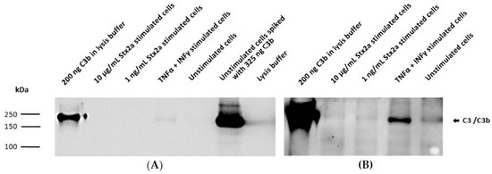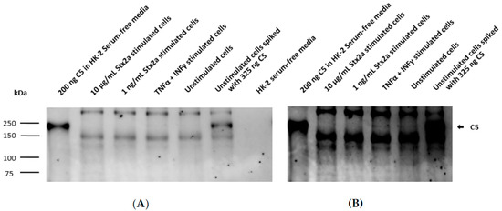 Taking into account the results obtained from the ELISAs, intracellular C3 and secreted C5 were also studied by Western blot. Concentrated lysates or supernatants from unstimulated cells, TNF-α- and IFN-γ-stimulated cells and cells stimulated with the higher and lower Stx2a concentrations (10 µg/mL and 1 ng/mL, respectively) were further examined for the presence of C3 and C5. A total of 200 ng of pure C3b or C5 was used as reference. Western blot results for complement C3 protein synthesis were in line with the results obtained from the ELISA. C3 was only detected in the concentrated lysates of TNF-α- and IFN-γ-stimulated cells (Figure 5A) and in lesser amounts (at longer exposure time of the blot) in the unstimulated cells (Figure 5B). However, C3 could not be visualized in the lysates from cells stimulated with 1 ng/mL and 10 µg/mL of Stx2a (Figure 5). ELISA results from C5 secretion were also translated on a Western blot, in which a corresponding C5 band can just be suspected in the concentrated supernatants of TNF-α- and IFN-γ-stimulated cells and in the unstimulated cells, while no C5 bands were detected in the Stx2a-stimulated samples (Figure 6).