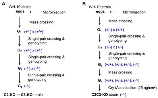 Crossing and selection for establishing homozygous knockout strains of P. xylostella. (A) Single knockout strains of PxABCC2 (C2-KO) or PxABCC3 (C3-KO). (B) Double knockout strain of PxABCC2 and PxABCC3 (C2C3-KO).