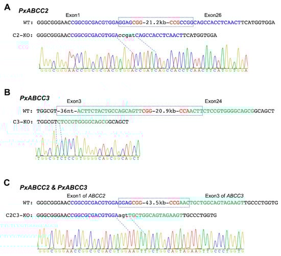 Sequences of the wild type (WT) and knockouts of PxABCC2 and PxABCC3 flanking the target sites of dual sgRNAs for introducing deletion mutations. (A) Knockout strain of PxABCC2 (C2-KO). (B) Knockout strain of PxABCC3 (C3-KO). (C) Double knockout strain of PxABCC2 and PxABCC3 (C2C3-KO). Boxes indicate the deleted genomic DNA fragments. Target sites of sgRNAs are highlighted in blue (PxABCC2) and green (PxABCC3).