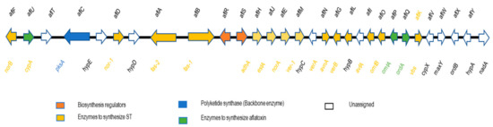 Researchers have also explored the genetic makeup of strains that differ in AF production. Yu et al. (2005) reported clusters of biosynthesis genes involved in AF production for the first time [133]. In a later study of genomic function, researchers found that at least 30 genes and 20 enzymatic reactions are involved in AF biosynthesis [134]. These genes are clustered within a 75 kb DNA region in the chromosome 3 biosynthesis pathway, and most of them have been identified and sequenced [134,135,136] (Figure 1). Subsequent studies showed that those strains that do not produce AFs have either lost some genes or have specific mutations in the AF biosynthetic pathway. Such mutations were found to be caused by deletions of biosynthesis genes [45,48] or by insertions [48] and/or frameshifts [133] or single nucleotide polymorphisms [137] in genes involved in AF biosynthesis. These findings were supported by the presence of deletions, frameshift mutations, base pair substitutions, and termination point mutations in the AF synthesis pathways of two atoxigenic and domesticated varieties of A. flavus (A. oryzae and A. sojae) [138]. Researchers can use these findings to develop biocontrol agents from atoxigenic A. flavus strains that can be applied as a mitigation tool against toxin-producing strains either in the field or in storage.