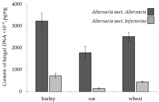 The amounts of Alternaria spp. DNA belonging to the two sections differed significantly by cereal grain (Figure 1). The barley contained significantly more A. sect. Alternaria DNA (3233 × 10−4 pg/ng) than oat (1781 × 10−4 pg/ng) and wheat (2521 × 10−4 pg/ng). The highest average amount of A. sect. Infectoriae DNA was also found in barley (729 × 10−4 pg/ng), which was 1.6 times more than that in wheat (445 × 10−4 pg/ng) and 4.9 times more than that in oat (148 × 10−4 pg/ng).