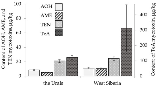 Mycotoxins AOH and AME were more frequent in grain from the West Siberia region (30% and 15% of samples, respectively) than in grain from the Urals (23% and 9%, respectively). The frequency of occurrence of TEN and TeA in grain from two regions was similar: TEN in 91% of the samples from the Urals and in 89% of the samples from West Siberia and TeA in 85% of the samples in each region. The contents of AOH, AME and TEN in grain from West Siberia (11, 10 and 21 µg/kg), on average, were similar to those in grain from the Urals (9, 5 and 24 µg/kg). At the same time, the TeA content in grain from West Siberia was 312 ± 154 µg/kg, which was 2.6 times higher than that in grain from the Urals (121 ± 14 µg/kg), but this difference was not significant.