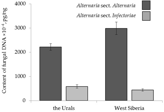 The amount of A. sect. Alternaria DNA in grain from the Urals averaged (2215 ± 139) × 10−4 pg/ng, while in grain from West Siberia, the content of these fungi was significantly higher at (2989 ± 262) × 10−4 pg/ng. The amounts of A. sect. Infectoriae DNA in grain samples from the Urals and West Siberia were lower, and there was no significant difference between them: (587 ± 139) × 10−4 and (440 ± 90) × 10−4 pg/ng, respectively (Figure 3).